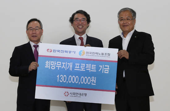 [프라임경제] 한국전력공사(사장 조환익)는 지난달 30일 전력노조 및 사회연대은행과 함께 저소득 취약계층 자립 및 지역경제 활성화를 위한 '희망무지개프로젝트' 기금 전달식을 시행했다.