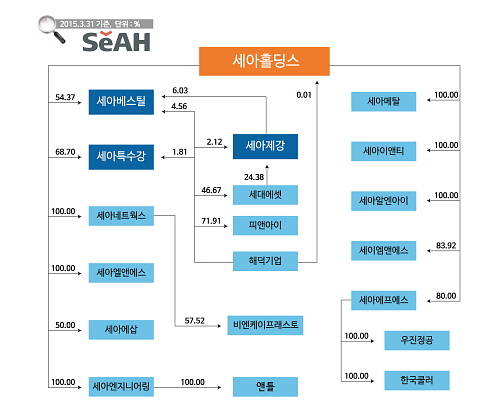 지분구조표를 보면, 세아홀딩스는 세아그룹을 국내 특수강시장 1위에 올려놓은 세아베스틸과 세아특수강 지분을 각각 54.37%, 68.70% 보유하고 있다.