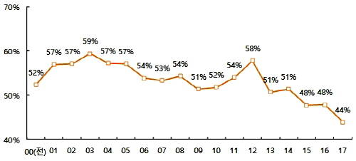 문제는 해가 갈수록 서울 소재 오피스텔 전용률이 눈에 띄게 내려간다는 점이다. 입주예정물량을 포함한 연도별 전용률을 보면 △2012년 58% △2013년 51% △2014년 51% △2015년 48% △2016년 48% △2017년 44%다.