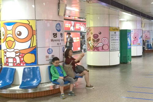 이번 명동 캐릭터 역사의 주인공은 뽀로로로, 서울시는 국산 애니메이션 '뽀롱뽀롱 뽀로로' 제작사인 ㈜아이코닉스의 투자를 받아 명동역사 내에 뽀로로 캐릭터 이미지 32컷을 우선 설치했다.