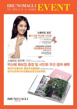 특히 브루노말리는 12일부터 14일까지 스페치오 씬즈백을 구입한 고객 50명에게 박신혜 사인회 우선 참여 기회와 함께 화보집을 증정한다.