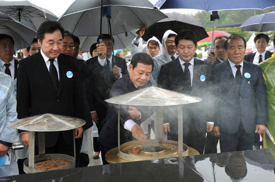 [프라임경제] 윤장현 광주광역시장과 권영진 대구광역시장이 18일 오전 국립518민주묘지에서 열린 '제35주년 5·18민주화운동 기념식'에 참석해 참배하고 있다.