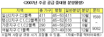 2일 주택공사와 부동산 정보업체 닥터아파트(www.DrApt.com)에 따르면 주공이 연내 분양하는 전용면적 25.7평 초과 중대형 일반분양 아파트는 4곳 1867가구에 달하는 것으로 나타났다. 이는 2006년의 1037가구보다 600가구 이상 많은 것이다.