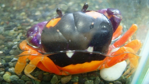 타일랜드 크랩은 몸집은 할로윈 크랩과 비슷하지만 외모는 더욱 터프하다. 환경 적응력이 뛰어나고 생명력이 강하다. 성격이 대담하고 행동이 민첩해 키울 때 집게발에 공격 당하지 않도록 주의할 것. 7500원.