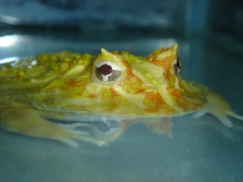 팩맨(사진)은 반수생이므로 어항에 물을 약간 담고 육지를 만들어주면 키울 수 있다. 성격은 온순한 편이지만 식탐이 있고, 자기 몸 크기만한 먹이도 삼키므로 반드시 단독 사육해야 한다.