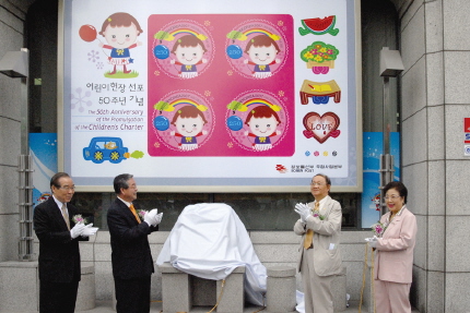 [프라임경제]4일 오전 광화문우체국 앞에서 정경원 우정사업본부장(왼쪽 두 번째), 배동익 색동회장(왼쪽 세 번째), 권영수 한국우취연합회장(왼쪽 첫째), 김명자 색동회 부회장(왼쪽 네 번째)이 어린이헌장 선포 50주년 기념우표 제막식을 열고 있다.