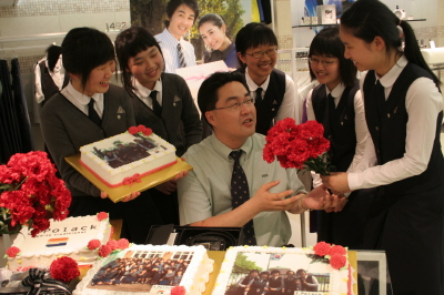 [프라임경제]코오롱패션 제이폴락은 스승의 날을 맞아 선생님과 학생이 함께 찍은 행복한 추억을 담은 포토 케이크를 제작해 인근학교에 전달했다. 사진은 매장을 찾은 학생들이 자신들과 선생님의 사진이 담긴 포토케이크를 신기한 듯 바라보며 이야기를 나누고 있다.