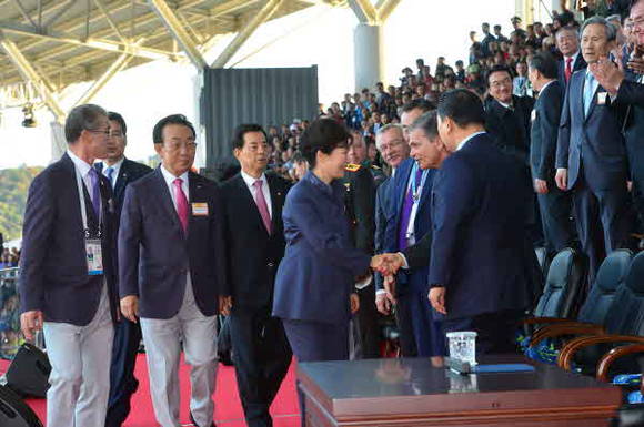 이날 개막식에는 박근혜 대통령, 한민구 국방부장관, 김관용 경북도지사, 김상기 공동조직위원장, 알둘하킴알시노 CISM 회장 등 1만8000여명이 참석했다.