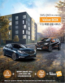 Value BOX는 QM3 또는 SM5를 르노캐피탈 할부 상품으로 구매하는 경우에 제공되는 금융서비스로서 보증연장서비스, 운전자보험, 그리고 신차교환보장프로그램이 포함된 패키지 서비스이다.