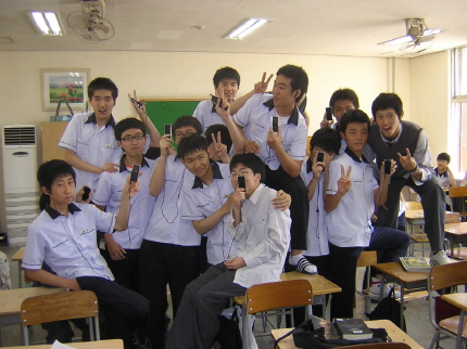www.latale.com)’의 ‘우리반 최고’ 이벤트에서 1등을 차지한 서울 면목고 2학년 7반 학생들이 선물로 받은 MP3를 받고 환호하고 있다.