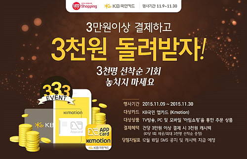 이번 이벤트는 KB국민 앱카드인 'K-모션'을 처음 이용하는 고객 대상이다. 선착순 3000명에게 3만원 이상의 상품 결제시 3000원을 돌려준다. 1인당 1회에 한해 TV홈쇼핑뿐만 아니라 PC 및 모바일쇼핑몰(아임쇼핑)에서도 응모가 가능하다.