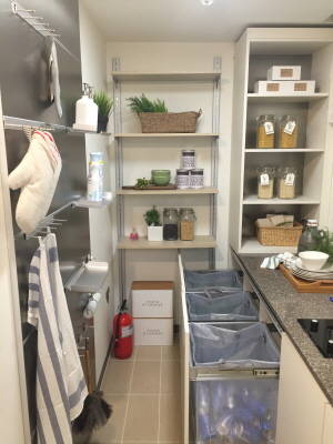 다양한 물품수납을 위해 벽부분에 높이조절은 물론 탈부착이 가능한 시스템선반을 적용했으며, 또 수분에 강한 타일을 적용해 채소 및 식료품 보관이 보다 용이하도록 했다.