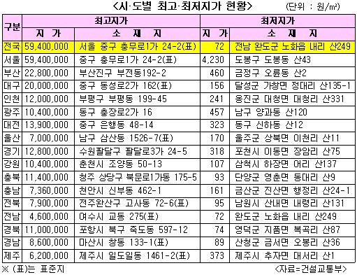 반면, 전국 최저 땅값은 평당 238원인 전남 완도군 노화읍 내리 산 249번지였다. 이곳은 지난해 평당 225원으로 최저가였던 경남 남해군 삼동면 지족리 759번지보다 평당 13원 가량 오른 것이다.