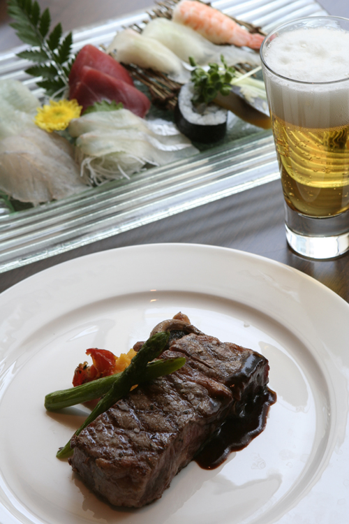 ‘참숯에 구운 스테이크 코스(4만8000원)’는 고바찌 요리 2종과 그릴드 치킨 샐러드, 살사 소프트 쉘 크랩과 쉬림프 칵테일, 스시 또는 사시미 등으로 구성된다. 메인 요리로 300일 이상 곡물로 사육한 호주산 소고기로 만든 꽃등심과 안심 또는 채끝 등심 스테이크가 제공된다.