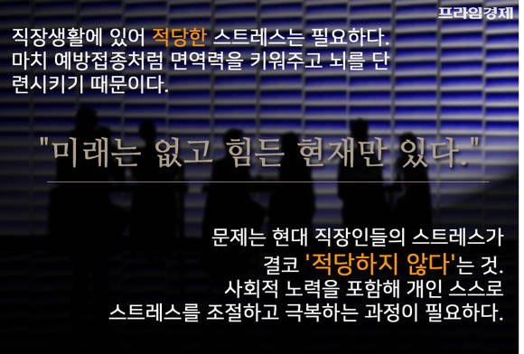직장생활에 있어 적당한 스트레스는 필요하다. 마치 예방접종을 하듯 면역력을 키워주고 뇌를 단련시키기 때문이다. 문제는 요즘 직장인의 스트레스는 '적당하지 않다'는 것. 사회적 노력은 물론 스스로 스트레스를 조절하고 극복하는 과정이 필요하다.