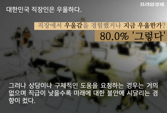 [프라임경제] 대한민국 직장인 10명 중 8명은 우울하다. 그러나 상담이나 구체적인 도움을 요청하는 경우는 거의 없으며 직급이 낮으면 미래에 대한 불안에 시달리는 경향이 컸다.