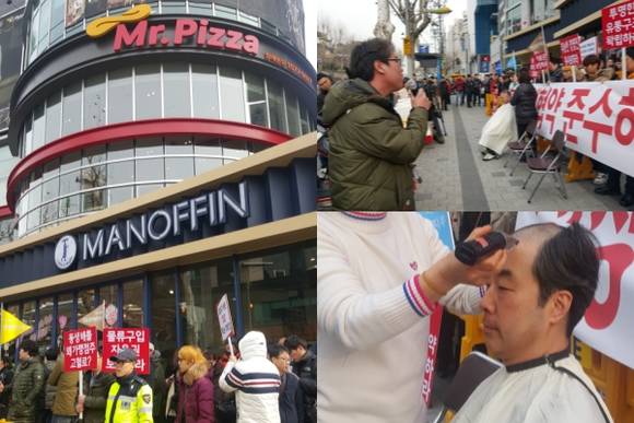 형민석 강원대점 사장을 시작으로 신동휘 진해점 사장, 이정용 전주평화 사장의 삭발식이 이뤄졌지만, 이들이 외치는 정우현 MPK그룹 회장은 끝내 얼굴을 보여주지 않았다.
