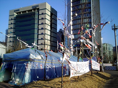 결국 노조원들과 해고자들은 노숙자인마냥 거리로 나서야했다. 서울과 구미를 그렇게 오가길 여러차례. 언제부터인가 상경투쟁이라는 낯선 행동은 자연스러운 일상으로 바뀌었다고 한다. 그리고 이제 이들은 과천 코오롱 본사 앞에 ‘진지’를 구축했다. 상경투쟁시 과천에 들리면 꼭 집회를 개최했던 반가운 장소다.
