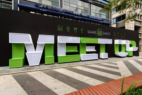 국내 쉐이크쉑 1호점 호딩 이벤트 테마는 'MEET UP, POWER UP'이다. 직육면체 블록을 쌓아 쉴 수 있는 의자와 테이블, 휴대폰 충전하는 케이블을 비치한 휴식공간으로 만들어 휴대폰을 충전하듯 우리 모두 힘내자는 의미를 담았다.