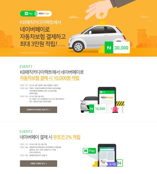 KB손해보험은 오는 30일까지 네이버페이로 KB매직카다이렉트 자동차보험을 결제하는 고객에게 결제 금액 2%(최대 2만원)의 네이버페이 포인트를 적립해준다.