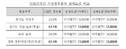 공정위에 따르면 CJ헬로비전의 23개 방송구역 중 합병법인이 점유율 1위를 차지하는 방송구역은 21개에 달한다. 특히 점유율이 작게는 46,9%에서 크게는 76.0%로, 해당 권역 시장지배력이 강하다고 판단했다.