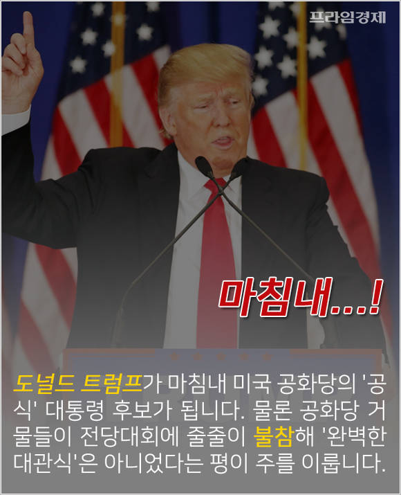 [프라임경제] 도널드 트럼프가 20일(현지시각) 마침내 미국 공화당의 '공식' 대통령 후보가 됩니다. 물론 공화당 거물들이 전당대회에 줄줄이 불참해 '완벽한 대관식'은 아니었다는 평이 주를 이룹니다.