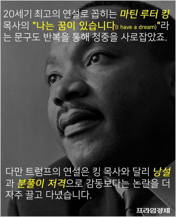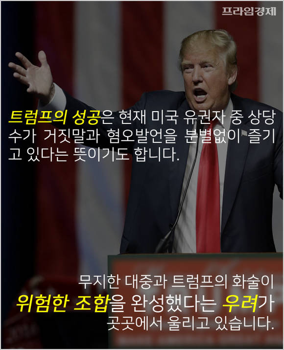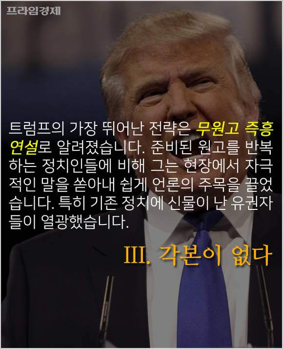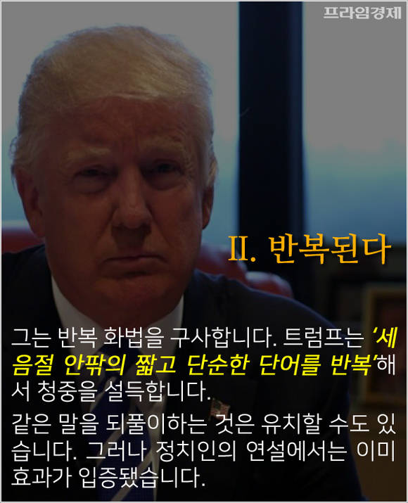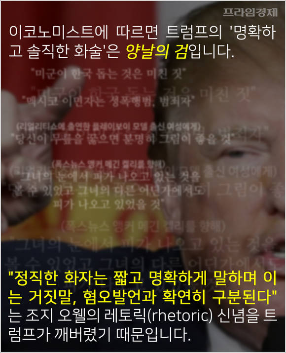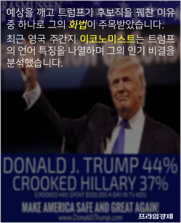 도를 넘는 설화에도 트럼프가 후보직을 꿰찬 것에 대해 전문가들은 그의 화법을 이유로 꼽습니다. 최근 영국 경제주간지 이코노미스트는 트럼프의 언어 특징을 거론하며 그의 인기 비결을 분석했습니다.
