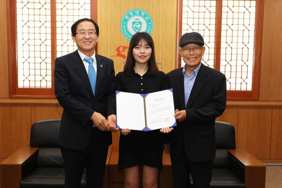 이날 장학금 전달식에는 이상경 총장과 장학기금 설립자인 김영기 명예교수, 사회과학대학 행정학과 최연정 장학생 등이 참석했으며, 최연정 장학생은 2016학년도 정시모집 행정학과에 수석으로 합격해 300만원의 생활보조금을 지급받았다.