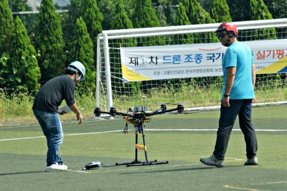 이날 시험에 나선 교육생들은 지난 7월4일부터 21일까지 ㈜대한무인항공서비스의 지원으로 부주산 체육공원에서 교육을 받고 지난 22일 시행된 필기시험을 통과, 20시간 이상 비행교육을 이수한 농민들이다.