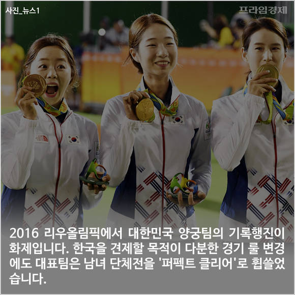 [프라임경제] 2016 리우올림픽에서 대한민국 양궁의 기록행진이 화제입니다. 한국을 견제할 목적으로 알려진 바뀐 경기 룰에도 우리 대표팀은 남녀 단체전을 '퍼펙트 클리어'로 석권했습니다.