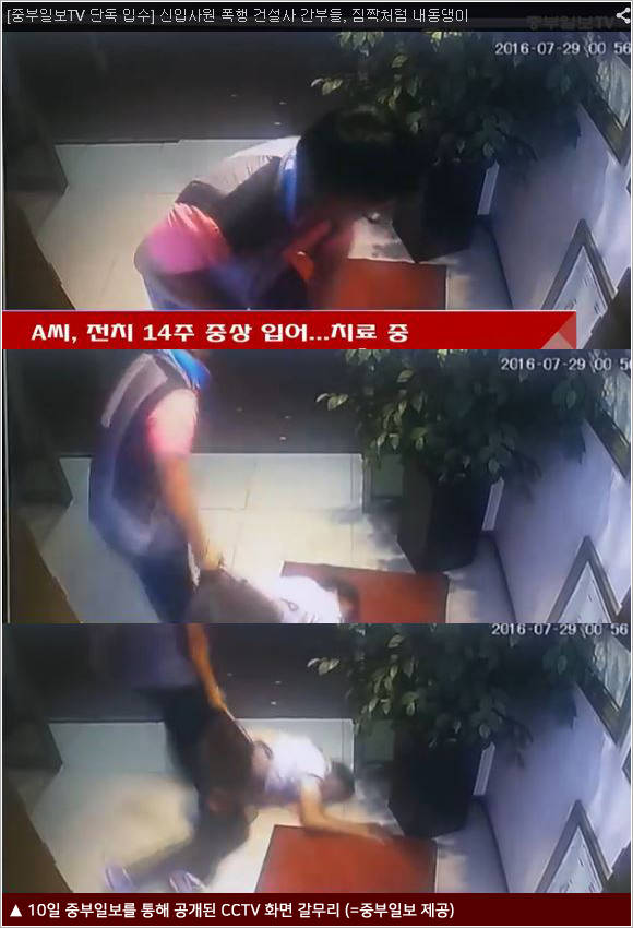 10일 중부일보 등에 따르면 지난달 29일 신입사원 A씨는 경기도 용인 소재 모 노래방에서 환영회 겸 회식에 참석했다가 '욕을 했다'는 이유로 상사 김모(44)씨 등 2명으로부터 폭행을 당했다. 현장 CCTV(폐쇄회로)에는 복부를 수차례 가격당한 A씨가 몸을 가누지 못한 채 누군가의 손에 끌려 나가는 장면이 고스란히 포착됐다.