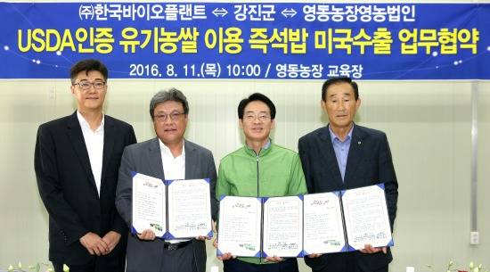 지난 11일 오전 전남 강진군 신전면 영동농장에서 강진군과 영동농장영농조합법인, 한국바이오플랜트가 즉석밥 미국 수출을 위한 업무협약(MOU)을 체결했다.