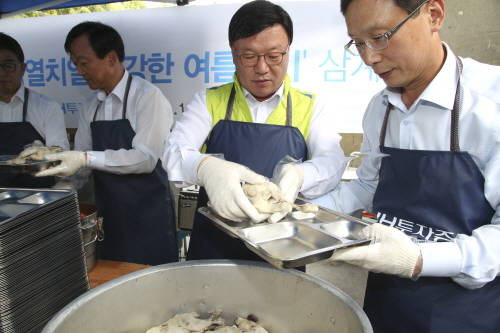 [프라임경제] NH투자증권(대표이사 김원규)은 본사 소재지 인근인 영등포 쪽방촌에서 거주민과 자활 노숙인들을 위해 삼계탕 700인분과 쌀을 전달하는 나눔 활동을 실시했다고 16일 밝혔다.