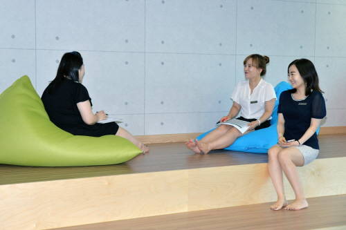 kt is는 힐링룸 확대에만 그치지 않고 '공동체 활동'과 '감성케어'에 특화된 휴게실도 지난 8월에 새로 선보였다. 새로 구축한 휴게실의 경우 컨설턴트들이 편안한 분위기에서 동료와의 소통을 유도하기 위해 계단 형 벤치에 빈백(Bean Bag)을 배치해 특색을 줬다.