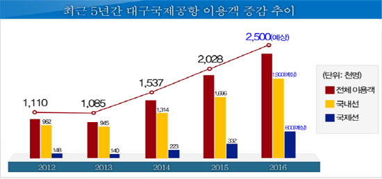 이와 같은 대구국제공항의 활황세는 △국제선 노선 신·증설 지속 및 노선 안정화 △저비용 항공사의 신규 유치(에어부산, 타이거에어) △부정기 노선 운항의 대폭 확충 △ 메르스(중동호흡기증후군) 사태로 위축됐던 항공수요 회복 등에 근거한다.