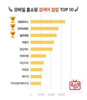 홈쇼핑모아에 설정된 검색어 알람은 지난 8월10일 기준 179만건이다. 이 중 상위 10위 내 5건을 이·미용 관련 검색어가 차지했다. 이·미용 관련 검색어 중에서는 견미리팩트가 2만8057건으로 가장 많았고 △데싱디바 1만2730건 △아토팜 1만2450건 △베리떼 1만1052건 △아이오페 에어쿠션 1만60건 순이다.