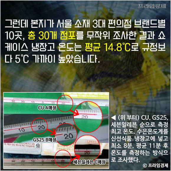 그런데 본지가 직접 서울 시내 소재 3대 편의점 브랜드, 30개 점포를 무작위 조사한 결과 쇼케이스 냉장고 온도는 평균 14.8℃로 규정보다 5℃ 가까이 높았습니다.