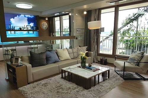 84㎡B 타입은 A와 같은 면적임에도 넓어 보이는 시각적 효과를 더했다. 해당 타입 역시 거실과 연결된 침실을 확장해 약 7.3m의 광폭 거실로 사용 가능하다.