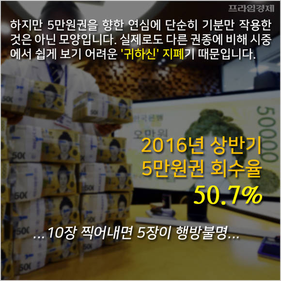 하지만 5만원권을 향한 연심에 단순히 기분만 작용한 것은 아닌 모양입니다. 실제로도 다른 권종에 비해 쉽게 보기 어려워운 '귀하신' 지폐가 됐기 때문입니다. 심지어 한국은행이 쉴 새 없이 신사임당 초상을 찍어내고 있다는 것을 감안하면 미스터리한 일입니다.