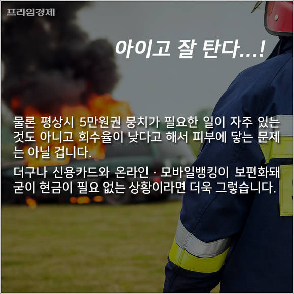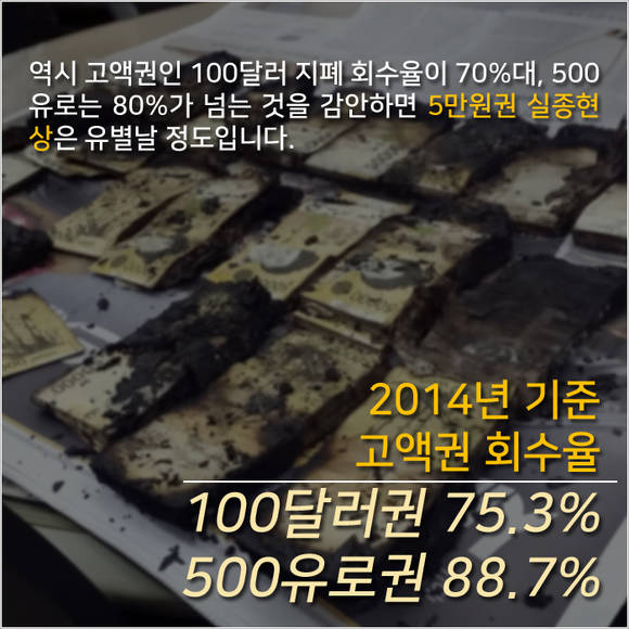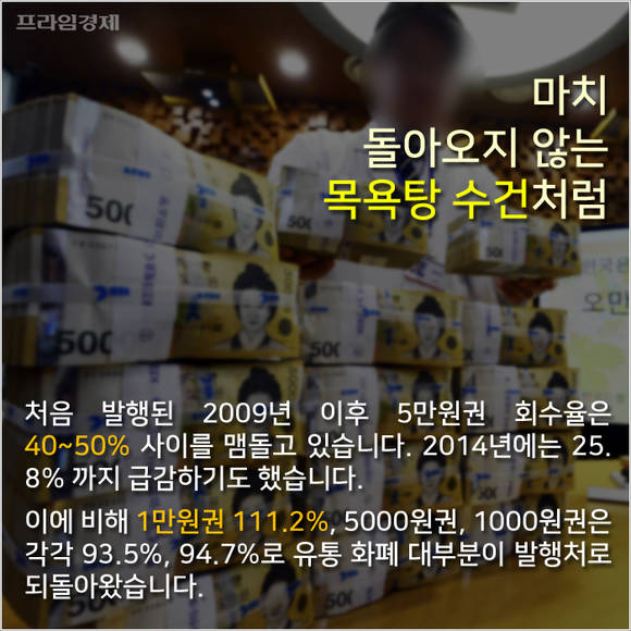 물론 일상에서 5만원권 뭉치가 필요한 일이 자주 있는 것은 아니므로 회수율이 낮다고 해서 큰 문제는 아니라 여기기 쉽습니다. 더구나 신용카드와 온라인·모바일뱅킹이 보편화돼 굳이 현금이 필요 없는 상황이니 무심하기 쉽습니다.