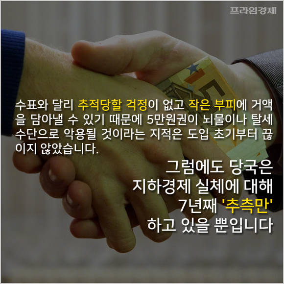 그러나 '지하경제' 활성화에 5만원권이 악용되고 있다는 의심이 짙고 숨어버린 5만원권은 우리 경제의 부진과 저성장이 심화됐음을 나타내는 증거입니다. 심각하게 받아들일 문제죠.