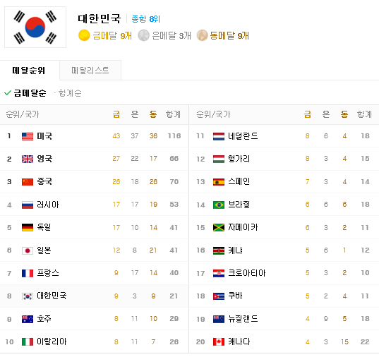 한국은 21일(현지시간) 박인비가 여자 골프에서 금메달을 따면서 9개로 금메달 기준 8위에 올라와 있다. 일본은 12개로 6위다. 폐막을 하루 앞둔 상황에서 일본을 역전할 가능성은 없다.