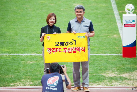 지난 21일 광주월드컵경기장에서 열린 수원FC와의 홈경기에 앞서 보해양조 임지선 대표이사와 광주시민프로축구단 정원주 대표이사는 관계자 및 관람객 2000여 명이 참석한 가운데 MOU 체결과 후원물품 전달식을 가졌다.