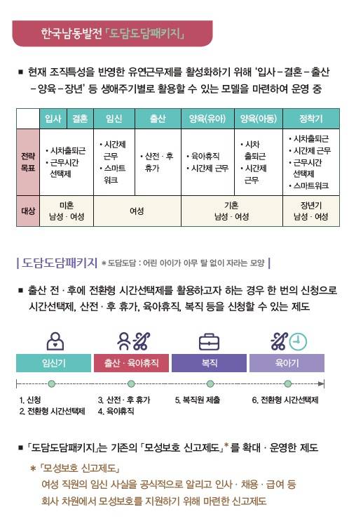 도담도담 패키지는 직원들이 복잡한 절차 없이 단 한 번의 신청으로 △전환형 시간선택제 △임산부 근로시간단축제 △출산 전·후 휴가 △육아휴직 △복직 등이 가능하도록 시스템이다.