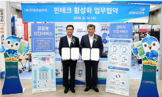 [프라임경제] DGB금융그룹 대구은행(은행장 박인규)과 핀테크놀러지(대표이사 김용태)는 24일 대한민국IT융합엑스포가 열리는 대구 엑스코 행사장에서 핀테크 활성화와 비대면 영업 강화를 위한 업무협약식을 체결했다.