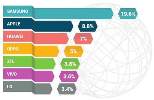 22일 글로벌 시장조사기관 카운터포인트리서치에 따르면 삼성전자는 전 세계 휴대폰 시장점유율 19.6%를 기록해 1위를 차지했다. 8.8%를 차지한 애플은 2위를 기록했으며 중국의 화웨이는 7%로 3위를 기록했다.