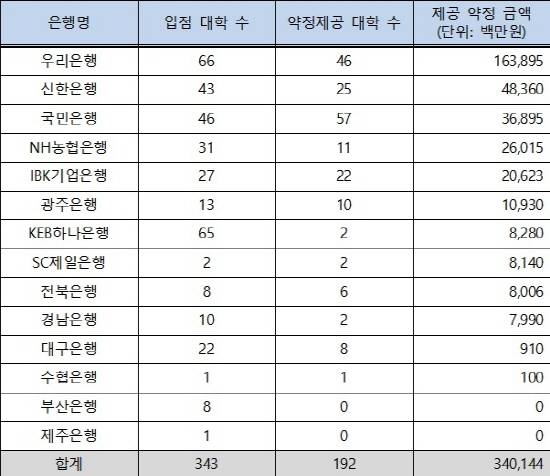 더불어민주당 김해영 의원은 23일 금융감독원이 제출한 '2016년 6월 기준 은행별 약정금액 제공 현황' 자료를 분석한 결과 12개 시중은행이 전국 대학에 제공하는 약정 금액이 총 3400억원대에 이른다고 밝혔다.