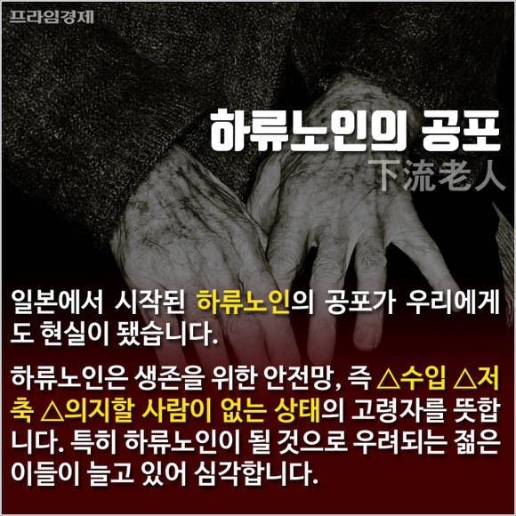 [프라임경제] 일본에서 시작된 하류노인의 공포가 우리에게도 현실이 됐습니다. 하류노인은 생존을 위한 안전망, 즉 △수입 △저축 △의지할 사람이 없는 상태의 고령자를 뜻합니다. 이와 함께 잠재적 하류노인이 우려되는 젊은이의 비중도 급증해 심각한 문제인데요.