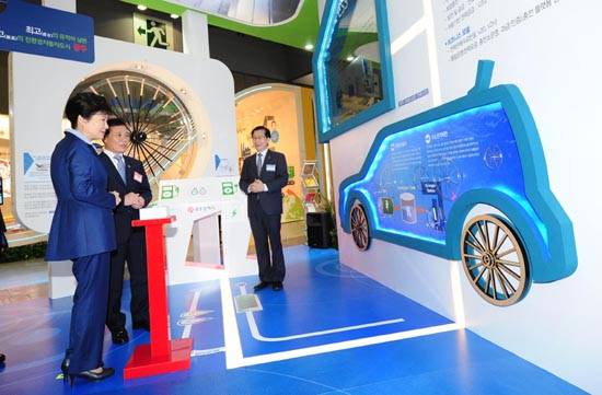 광주시 전시관을 찾은 박 대통령은 수소융합스테이션과 에너지저장시스템을 활용해 2000년 전 수레바퀴와 친환경자동차 바퀴가 회전하고, 지진과 자연재해 등 위급상황에서는 가정용 전기로 사용되는 모습을 봤다.