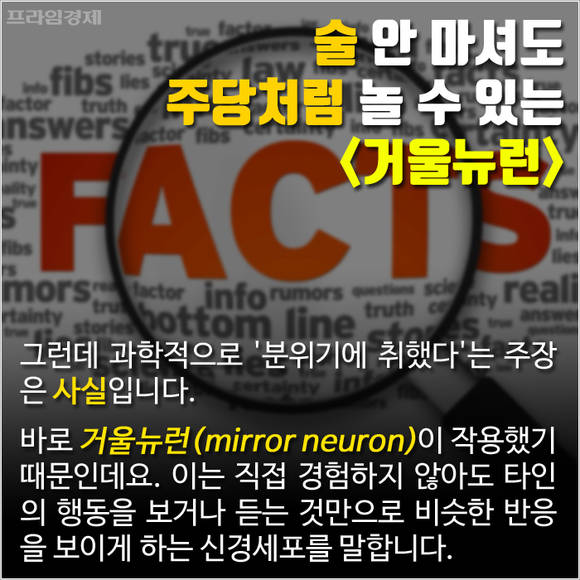 그런데 과학적으로 '분위기에 취했다'는 주장은 사실입니다. 바로 '거울뉴런(mirror neuron)' 때문입니다. 이는 직접 경험하지 않아도 다른 사람의 행동을 보거나 듣는 것만으로 비슷한 반응을 보이게 하는 신경세포를 말합니다.